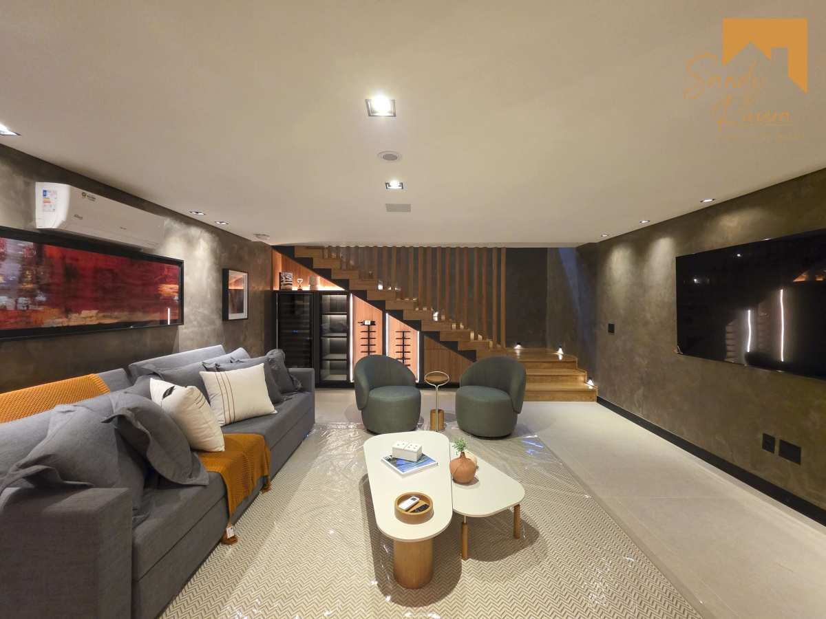 Uma elegante sala de TV no subsolo, ideal para sessões de cinema privativas, com adegas climatizadas, oferecendo um ambiente reservado e aconchegante para momentos especiais.